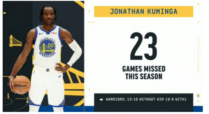 库明加本季缺席23场勇士13胜9负 出战时仅9胜9负促交易申请