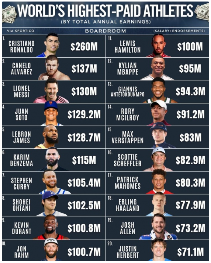 2025运动员收入榜:C罗居首 詹姆斯1.287亿第五库杜六七