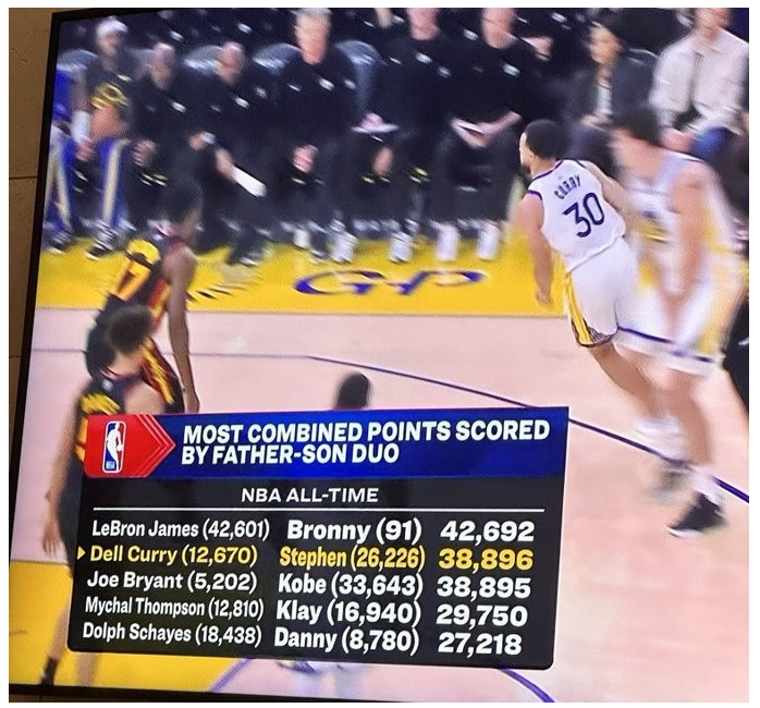 库里父子组合总分38910列第二,距詹姆斯父子仅差3782分